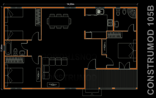 Casa de madera 105 m2 modelo C | CASA DE MADERA 105 m2 modelo C | | | |  Plano casa de madera 105 m2 C | 3 habitaciones 1 salón comedor 1 cocina 2 baños 1 terraza cubierta