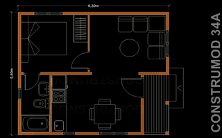 Plano casa de madera 34 m2 A | 1 habitación 1 salón comedor 1 cocina 1 baño 1 terraza cubierta