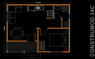Casa de madera 34 m2 modelo C | CASA DE MADERA 34 m2 modelo C | | | |  Plano casa de madera 34 m2 C | 1 habitación 1 salón comedor 1 cocina 1 baño 1 terraza cubierta