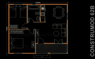 Casa de madera 62 m2 modelo B | CASA DE MADERA 62 m2 modelo B | | | |  Plano casa de madera 62 m2 B | 2 habitaciones 1 salón comedor 1 cocina 1 baño 1 terraza cubierta