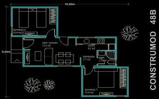 Plano Casa Moderna 48 m2 B | 2 habitaciones 1 salón comedor 1 cocina 1 baño 1 cubierta entrada