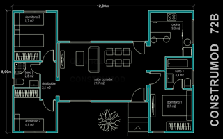 Plano Casa Moderna 72 m2 B | 3 habitaciones 1 salón comedor 1 cocina 2 baños 1 cubierta entrada